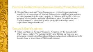 Procter Gambles Mission Statement Analysis. Procter Gamble purpose similar to a Mission StatementWe will provide branded products and services of superior quality and value that improve the. Procter.